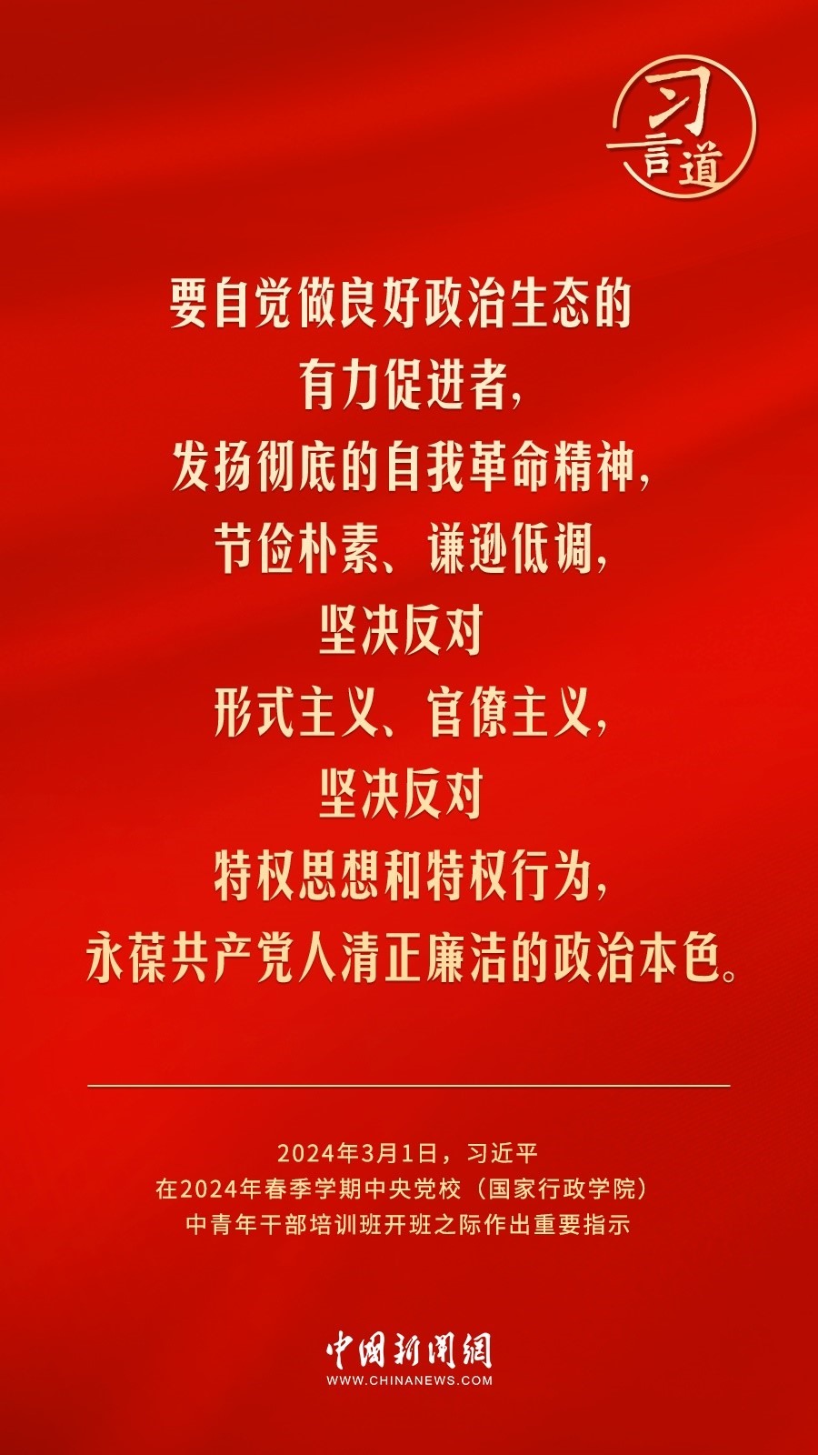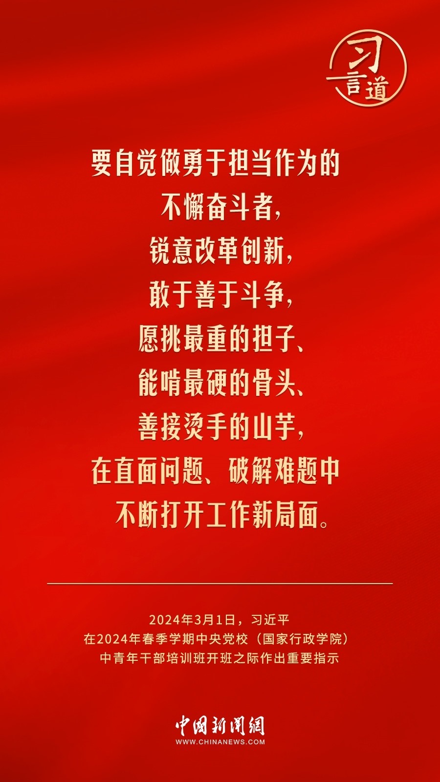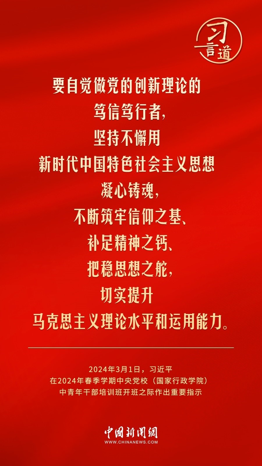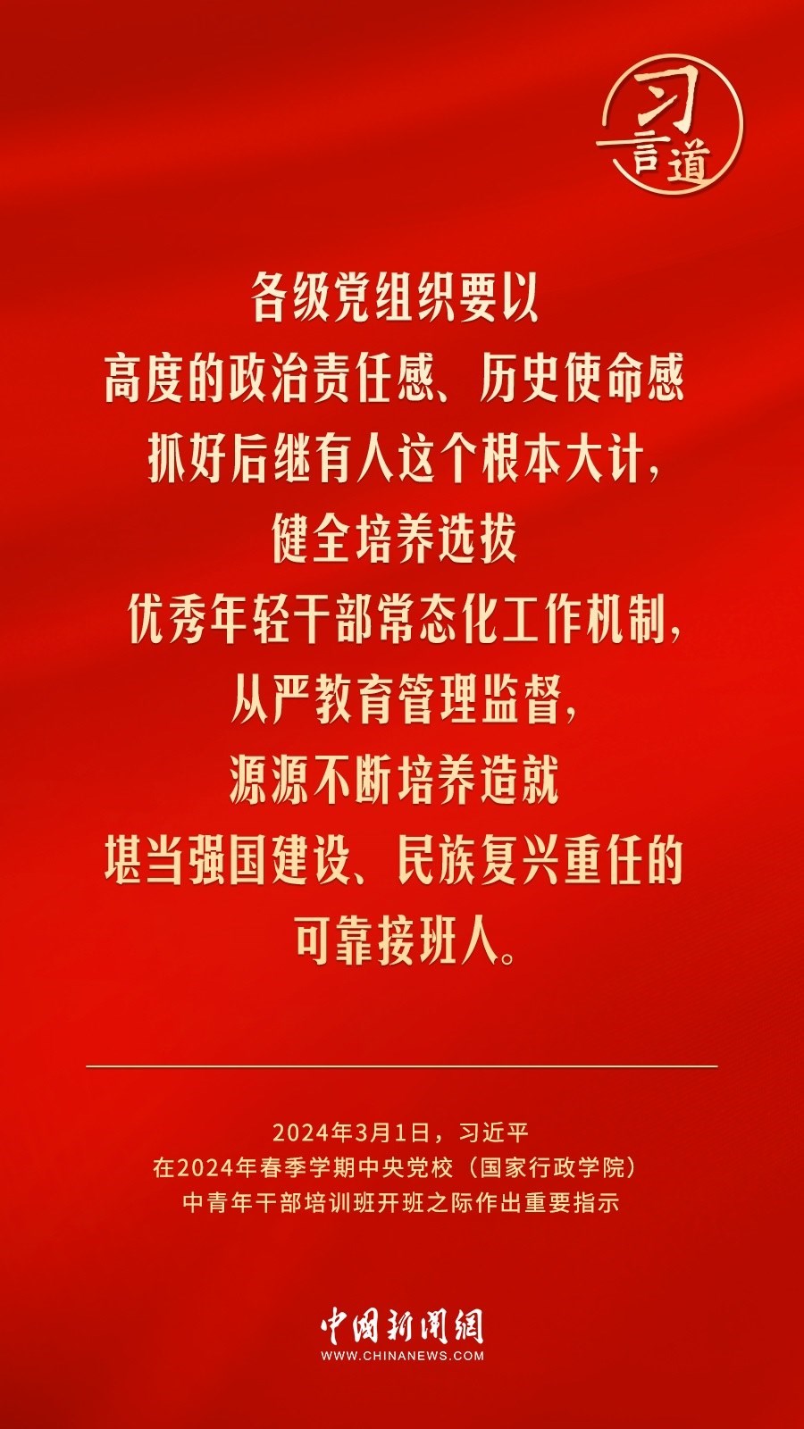 2024年春季學(xué)期中央黨校(國(guó)家行政學(xué)院)中青年干部培訓(xùn)班3月1日上午在中央黨校開(kāi)班。中共中央總書(shū)記、國(guó)家主席、中央軍委主席習(xí)近平作出重要指示,他強(qiáng)調(diào)——