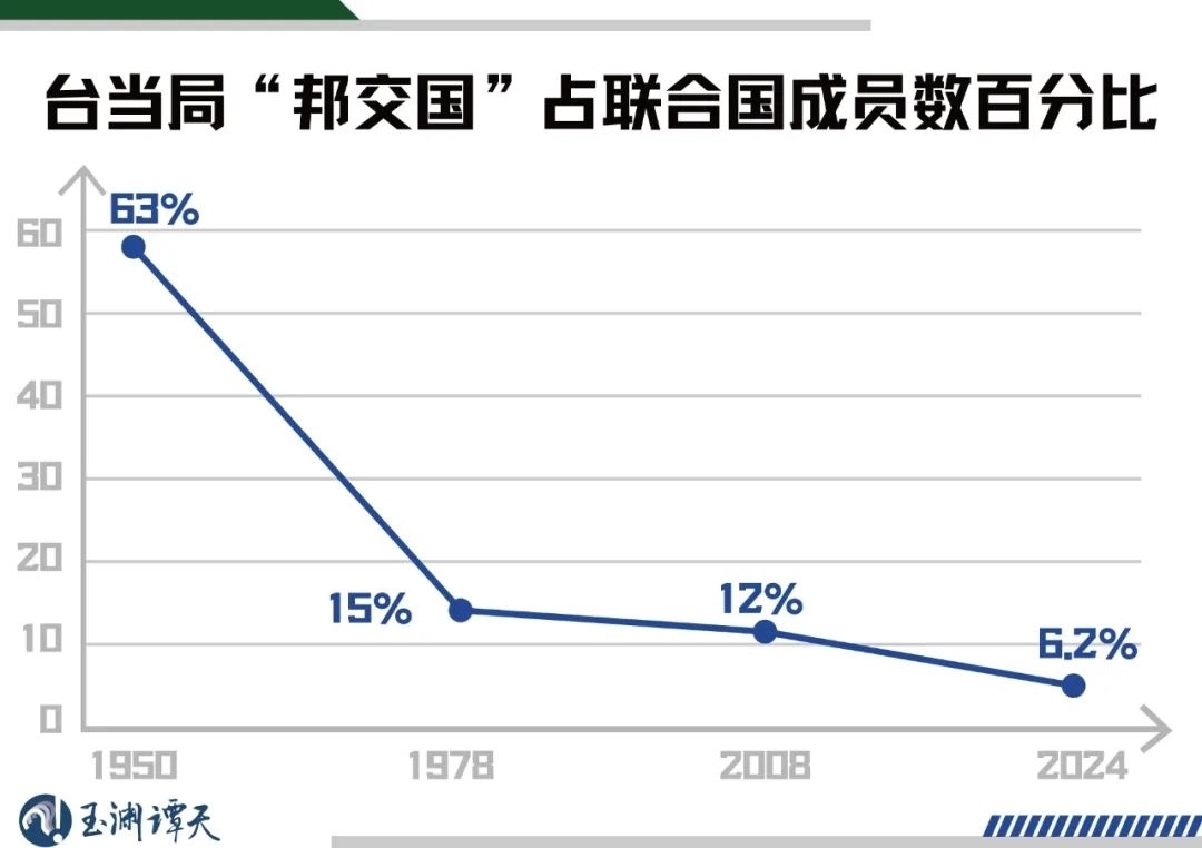 可以看到,1950年,臺灣當(dāng)局“邦交國”數(shù)量占聯(lián)合國成員國數(shù)量的比例,還高達(dá)63%。