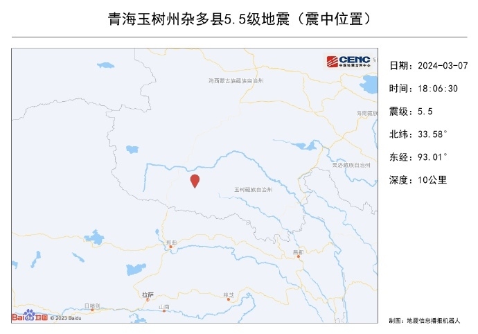 央視網(wǎng)消息:中國地震臺(tái)網(wǎng)正式測定:03月07日18時(shí)06分在青海玉樹州雜多縣(北緯33.58度,東經(jīng)93.01度)發(fā)生5.5級(jí)地震,震源深度10千米。據(jù)地震人口熱力圖數(shù)據(jù),震中周邊屬于高原無人區(qū),目前也暫未收到震感反饋。此次震中距離最近的西藏聶榮縣城177公里、距青海雜多縣城227公里,震中5公里范圍內(nèi)平均海拔約4809米。