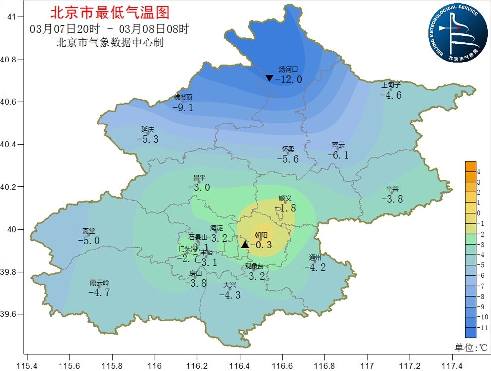 昨天夜間至今天早晨最低氣溫為-3.2℃。