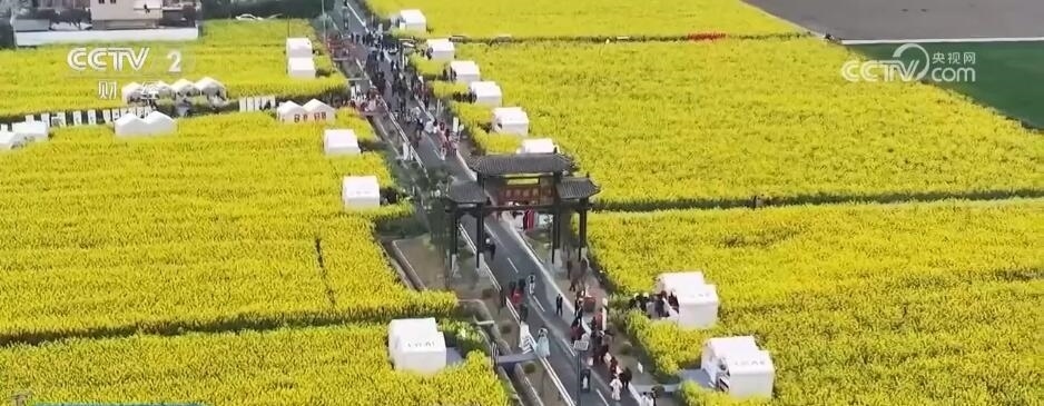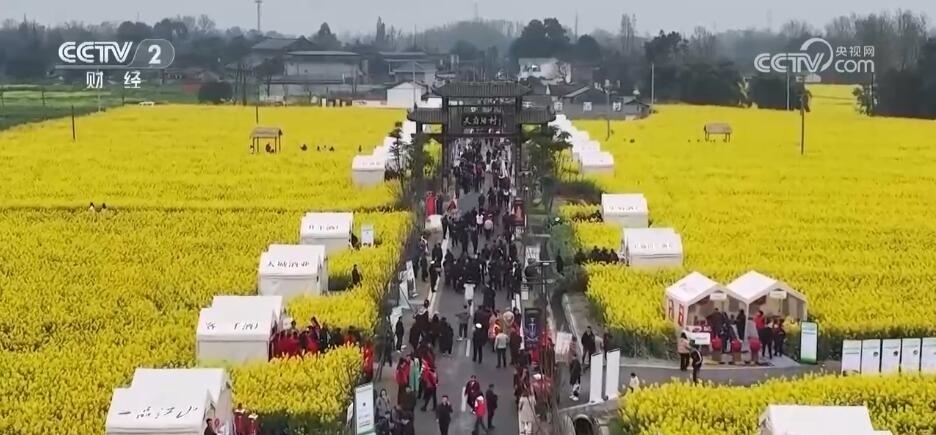 除了“花田火鍋”,在以油菜花田為背景的鄉(xiāng)村道路上,各類裝滿當?shù)靥厣r產(chǎn)品的攤位依次擺開。游客們迎著花香趕大集,帶走春日特有的伴手禮。