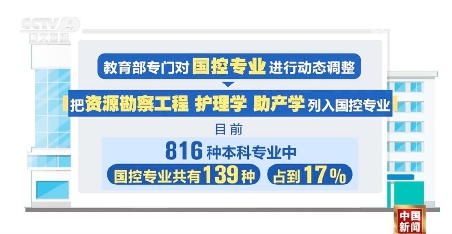 此次教育部專門對國控專業(yè)進行了動態(tài)調(diào)整,把資源勘察工程、護理學(xué)、助產(chǎn)學(xué)列入了國控專業(yè)。目前,816種本科專業(yè)中,國控專業(yè)共有139種,占到17%。未來,國控專業(yè)范圍還將進行“有進有出”的動態(tài)調(diào)整。
