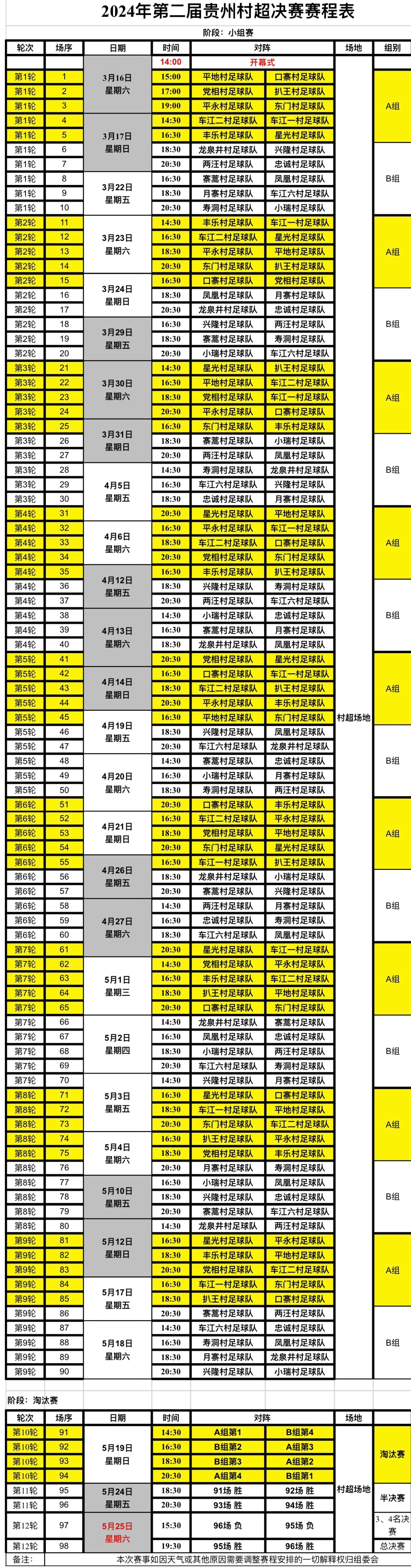 決賽階段的“村超”從3月16日開始,每周五到周日都會保證有比賽,逢節(jié)假日還會舉行加賽。球迷們只要在出發(fā)前記得確認一下賽程表即可。建議可以上午先到當?shù)赜斡[,體驗民俗文化,晚上再去觀看“村超”賽事。