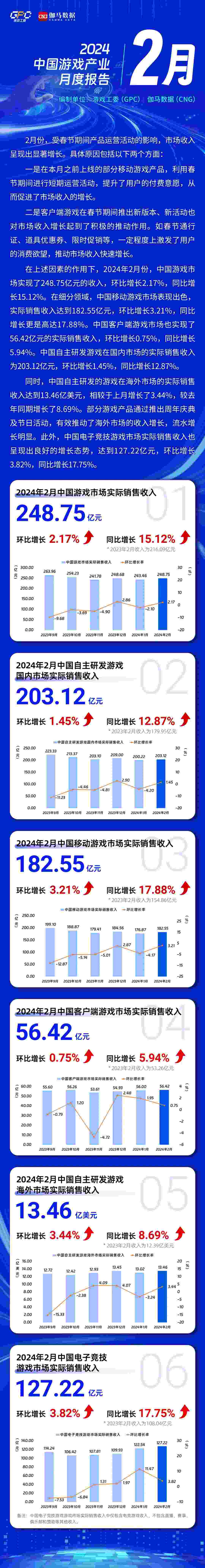 央視網(wǎng)消息:3月20日,據(jù)中國音數(shù)協(xié)游戲工委官微消息,2024年2月中國游戲產(chǎn)業(yè)月度報告發(fā)布。報告顯示,2024年2月份,中國游戲市場實現(xiàn)了248.75億元的收入,環(huán)比增長2.17%,同比增長15.12%。在細分領(lǐng)域,中國移動游戲市場表現(xiàn)出色,實際銷售收入達到182.55億元,環(huán)比增長3.21%,同比增長更是高達17.88%。中國客戶端游戲市場也實現(xiàn)了56.42億元的實際銷售收入,環(huán)比增長0.75%,同比增長5.94%。中國自主研發(fā)游戲在國內(nèi)市場的實際銷售收入為203.12億元,環(huán)比增長1.45%,同比增長12.87%。