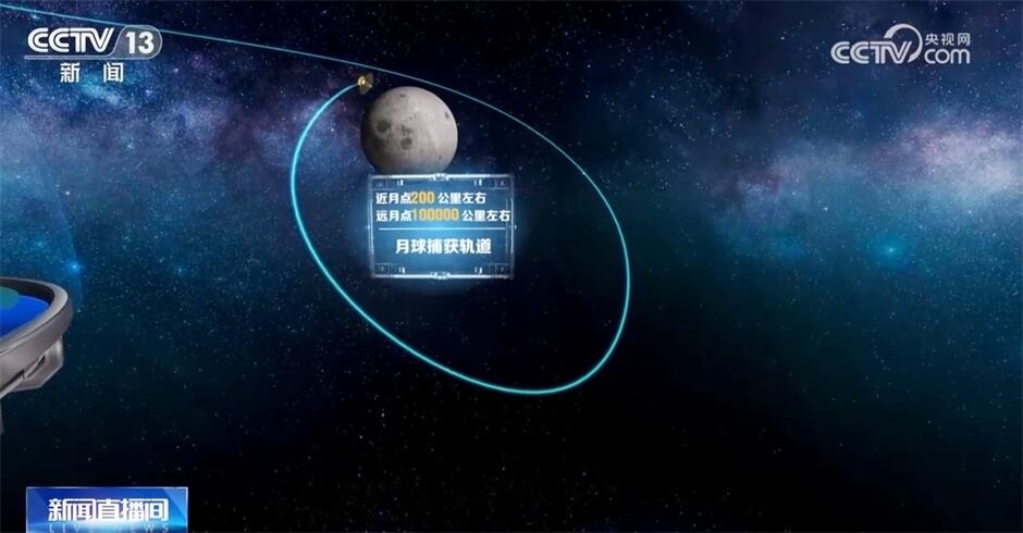 現(xiàn)在,鵲橋二號(hào)正在剎車!看,鵲橋二號(hào)被月球引力捕獲了!現(xiàn)在,它順利進(jìn)入了離月球最近點(diǎn)200公里、最遠(yuǎn)點(diǎn)10萬公里左右的月球軌道。