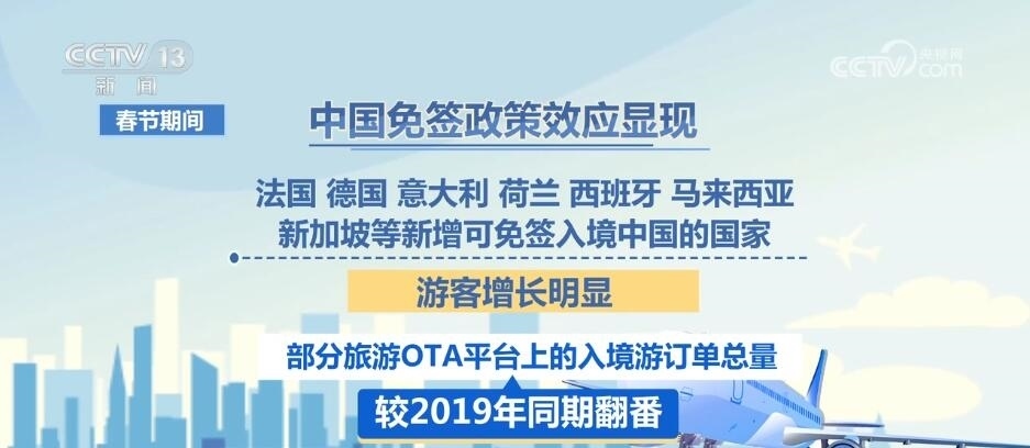 根據(jù)國家移民局統(tǒng)計數(shù)據(jù),2024年1月至2月,外籍人員入出境共計294.5萬人次,環(huán)比增長2.3倍,恢復至疫情前的41.5%。春節(jié)期間,中國免簽政策效應顯現(xiàn),法國、德國、意大利、荷蘭、西班牙、馬來西亞、新加坡等新增可免簽入境中國的國家,游客增長明顯,部分旅游OTA平臺上的入境游訂單總量較2019年同期翻番。