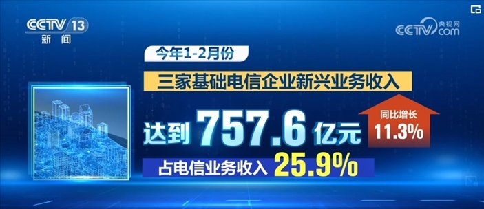 數(shù)據(jù)顯示,2024年1—2月份,三家基礎(chǔ)電信企業(yè)新興業(yè)務(wù)收入達(dá)到757.6億元,同比增長(zhǎng)11.3%,占電信業(yè)務(wù)收入的25.9%,其中,云計(jì)算和大數(shù)據(jù)收入分別同比增長(zhǎng)17.3%和30.3%。截至2月末,三家基礎(chǔ)電信企業(yè)發(fā)展蜂窩物聯(lián)網(wǎng)終端用戶23.64億戶,占移動(dòng)網(wǎng)終端連接數(shù)比重達(dá)57.5%。