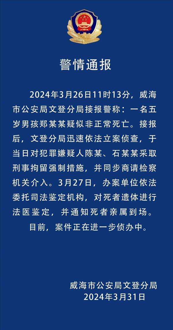 ·山東威海警方通報(bào)5歲男童疑被打致死事件:兩名犯罪嫌疑人被刑拘。