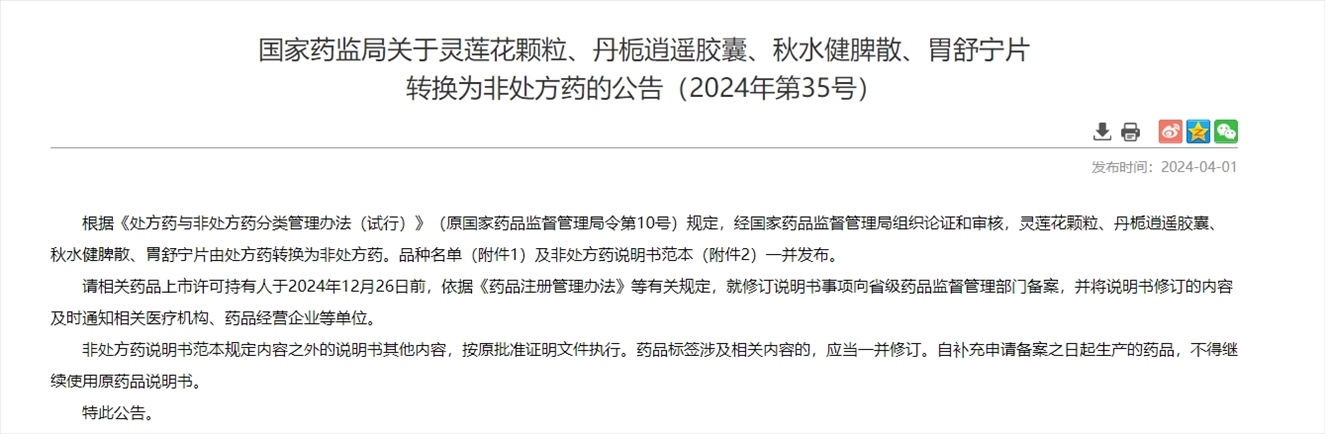 央視網(wǎng)消息:日前國家藥監(jiān)局網(wǎng)站發(fā)布公告,根據(jù)《處方藥與非處方藥分類管理辦法(試行)》(原國家藥品監(jiān)督管理局令第10號)規(guī)定,經(jīng)國家藥品監(jiān)督管理局組織論證和審核,靈蓮花顆粒、丹梔逍遙膠囊、秋水健脾散、胃舒寧片由處方藥轉(zhuǎn)換為非處方藥。
