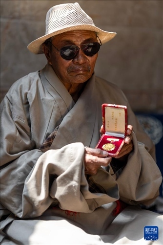 白瑪老人展示自己的全國勞動模范獎章(3月27日攝)。新華社記者 姜帆 攝