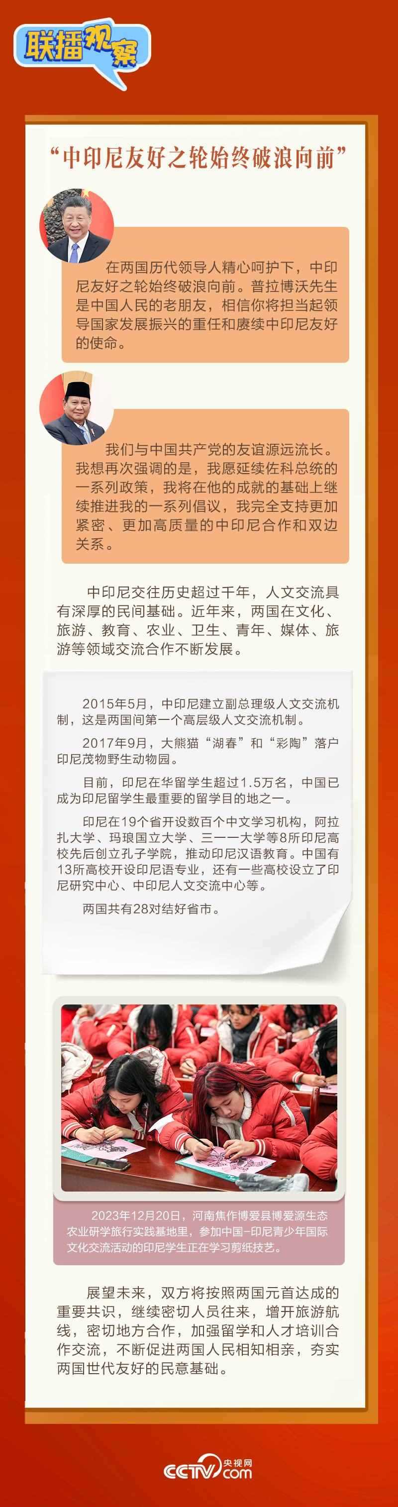 會談中,習主席以“船”為喻,稱贊“中印尼友好之輪始終破浪向前”,強調(diào)“愿同印尼深化全方位戰(zhàn)略合作,構(gòu)建具有地區(qū)和全球影響力的中印尼命運共同體”。普拉博沃當選總統(tǒng)表示“中國是印尼強有力的合作伙伴”,并指出“完全支持發(fā)展更加緊密的印尼同中國關(guān)系”。
