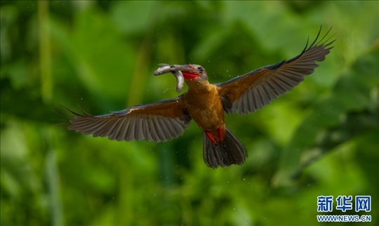 鸛嘴翡翠進(jìn)食瞬間(3月30日攝)。新華網(wǎng)發(fā)(朱邊勇 攝)