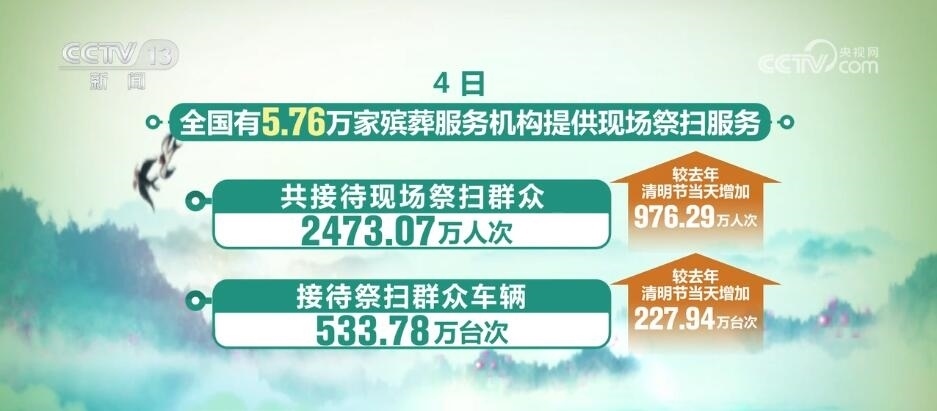 4日,全國有5.76萬家殯葬服務(wù)機構(gòu)提供現(xiàn)場祭掃服務(wù),共接待現(xiàn)場祭掃群眾2473.07萬人次,接待祭掃群眾車輛533.78萬臺次,較去年清明節(jié)當天分別增加976.29萬人次和227.94萬臺次,其中選擇綠色低碳祭掃方式的群眾1712.97萬人次,占現(xiàn)場祭掃總?cè)藬?shù)的69.26%。