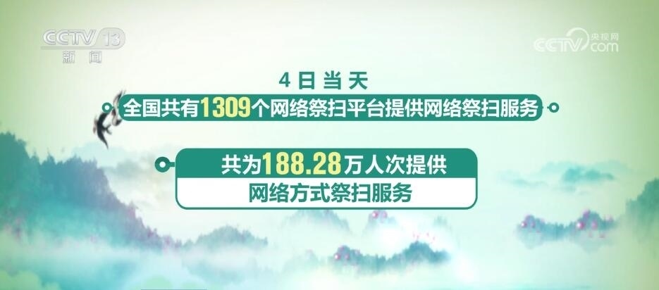 另外,4月4日當天全國共有1309個網(wǎng)絡(luò)祭掃平臺提供網(wǎng)絡(luò)祭掃服務(wù),共為188.28萬人次提供網(wǎng)絡(luò)方式祭掃服務(wù)。