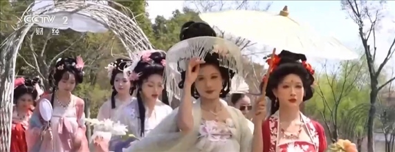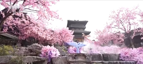 在江蘇常州,百萬株郁金香競相開放。櫻花、玉蘭、垂絲海棠等花木也開滿山谷,一簇簇粉白的花朵隨微風搖曳,宛若世外桃源。伴著音樂,十二花神身著漢服踏春而來,構(gòu)成本次花朝節(jié)一道亮麗的風景線。
