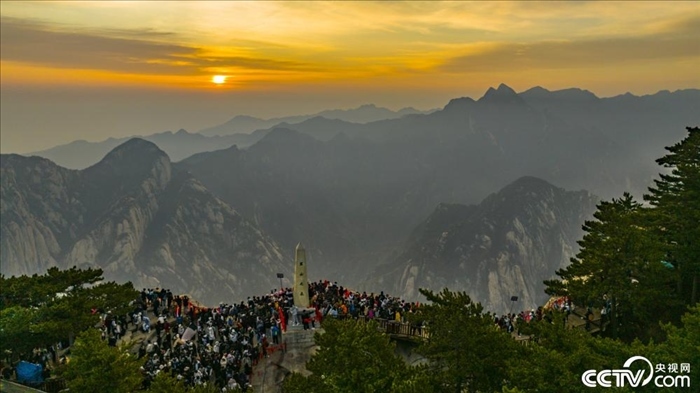 陜西渭南:游人共賞華山日出美景。