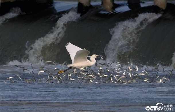 2024年4月9日,南京,秦淮河入江口,白鷺水面盤旋,捕食江中小魚。