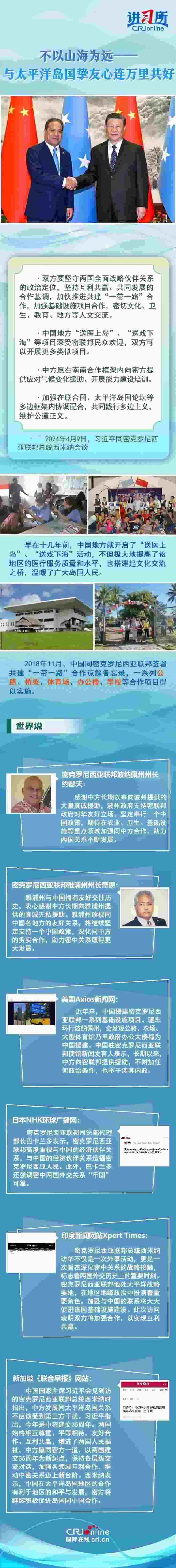 4月9日下午,中國(guó)國(guó)家主席習(xí)近平在北京同密克羅尼西亞聯(lián)邦總統(tǒng)西米納舉行會(huì)談時(shí)表示,每次見(jiàn)到太平洋島國(guó)的朋友,都感到很親切,中國(guó)地方“送醫(yī)上島”、“送戲下海”等項(xiàng)目深受密聯(lián)邦民眾歡迎,中方愿繼續(xù)為島國(guó)發(fā)展提供力所能及的支持,開(kāi)展三方或多方合作。