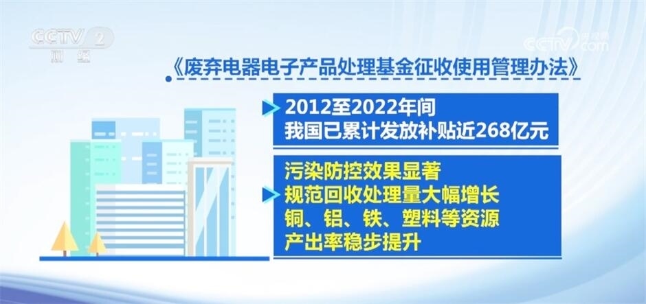 我國設(shè)立“廢棄電器電子產(chǎn)品處理基金”,用于補(bǔ)貼回收處理廢棄電器電子產(chǎn)品。根據(jù)《廢棄電器電子產(chǎn)品處理基金征收使用管理辦法》,2012至2022年間,我國已累計(jì)發(fā)放補(bǔ)貼近268億元,污染防控效果顯著,規(guī)范回收處理量大幅增長,銅、鋁、鐵、塑料等資源產(chǎn)出率穩(wěn)步提升。