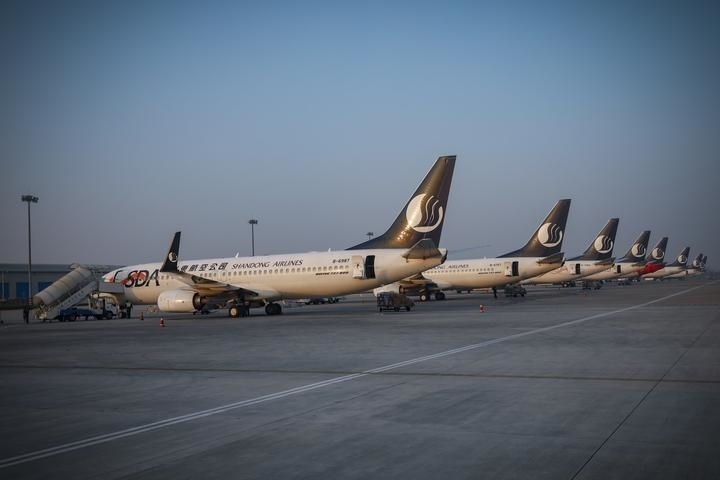 圖為山東航空在機場??康娘w機。(山東航空供圖)