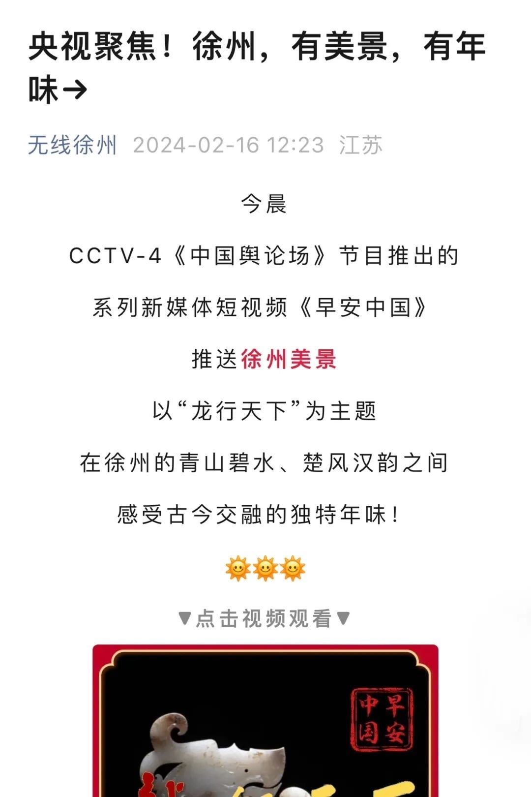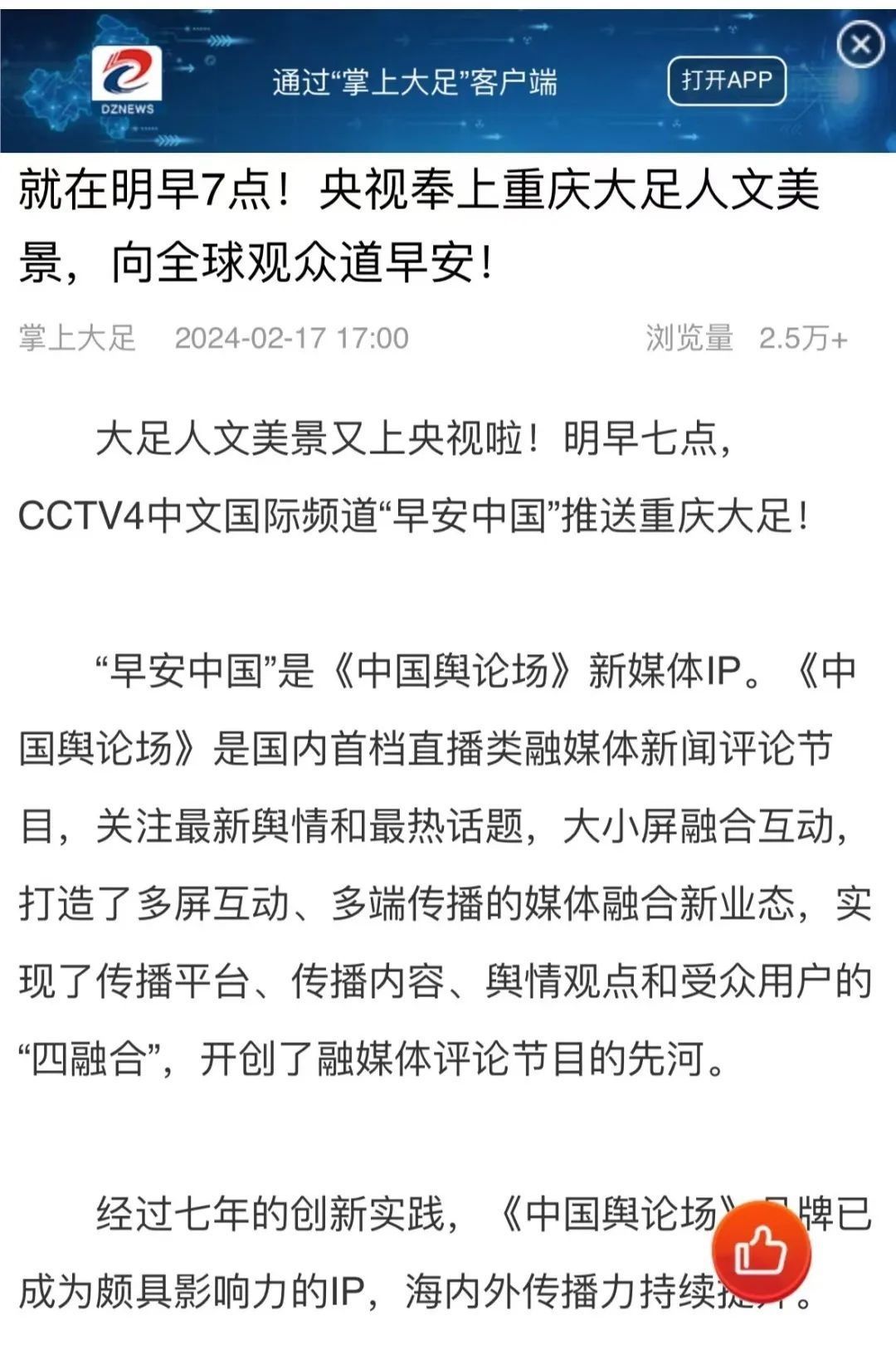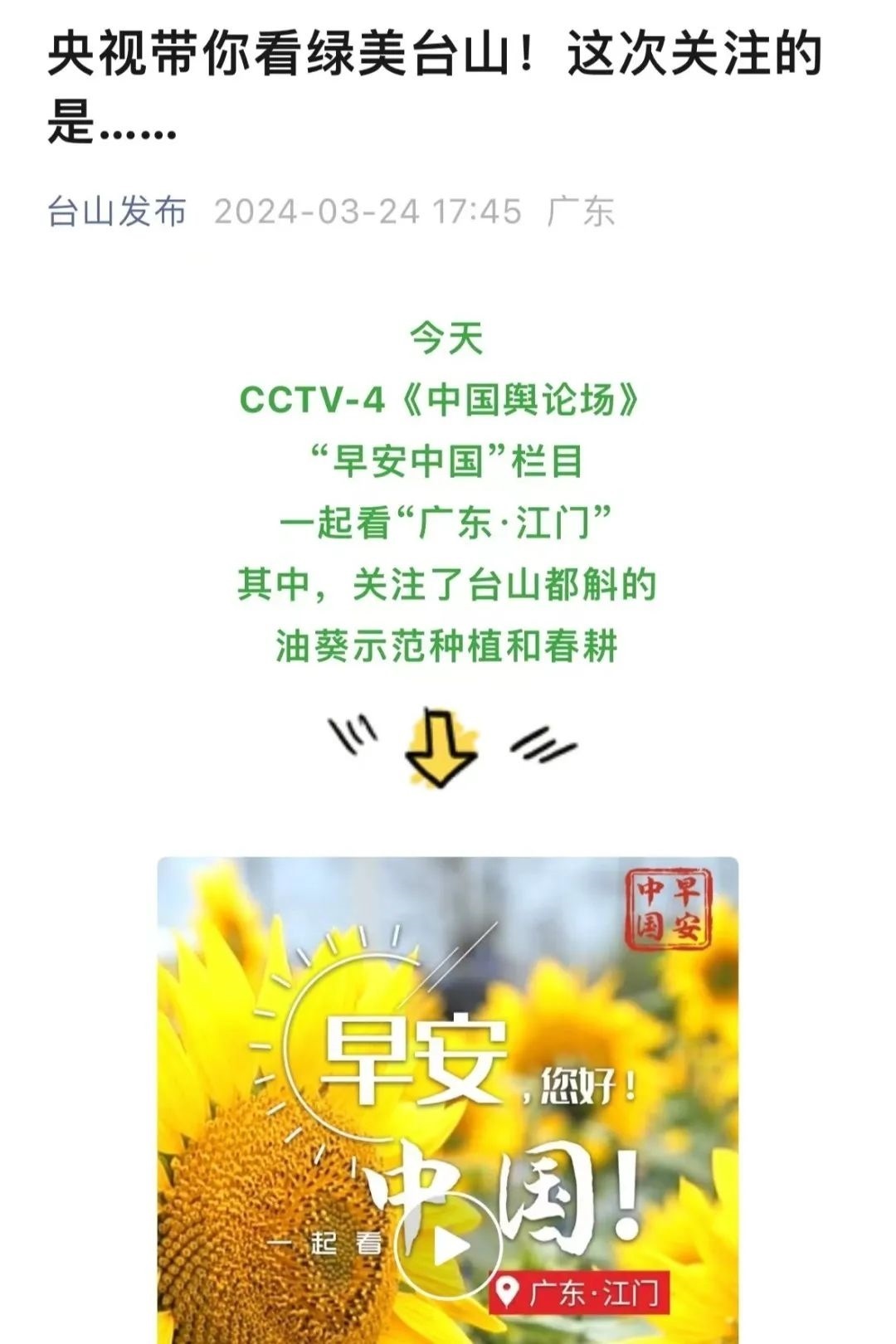 “央視帶你看綠美臺山,這次關注的是......”“就在明早7點!央視奉上重慶大足人文美景,向全球觀眾道早安!”“央視聚焦!徐州,有美景,有年味”“金葵向陽開,中春好景和風裁!美麗江門與您相遇央視《早安中國》”……越來越多的地方政府伸出橄欖枝,希望《早安中國》多“來”當?shù)匾挥[好風光。