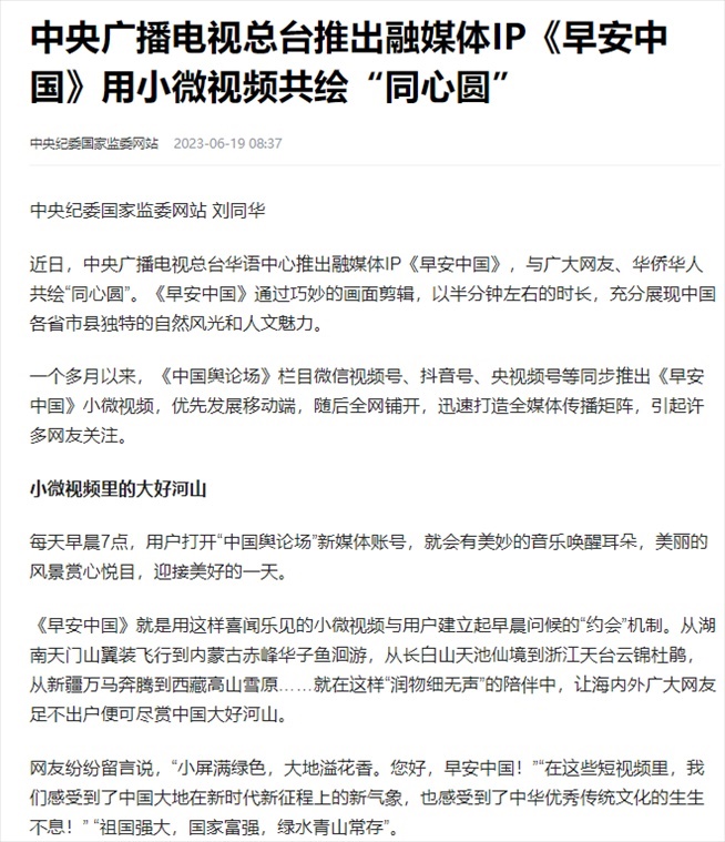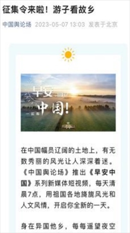 “早安中國切口新穎,有文化屬性和微記錄的氣質。”“每次片尾的結語字幕,都是從哪里選的?每天,都給我學習的機會。”“專業(yè)微記錄是媒體融合最寬廣的路。”……《早安中國》真真切切地緩解了許多海內外網(wǎng)友的故土思鄉(xiāng)情切,也收到了來自四面八方的認可及反饋?!吨袊浾搱觥饭?jié)目持續(xù)發(fā)出“游子看故鄉(xiāng)”征集令,請海外華僑華人說出對家鄉(xiāng)的思念和心中最想“打卡”的祖國美景。