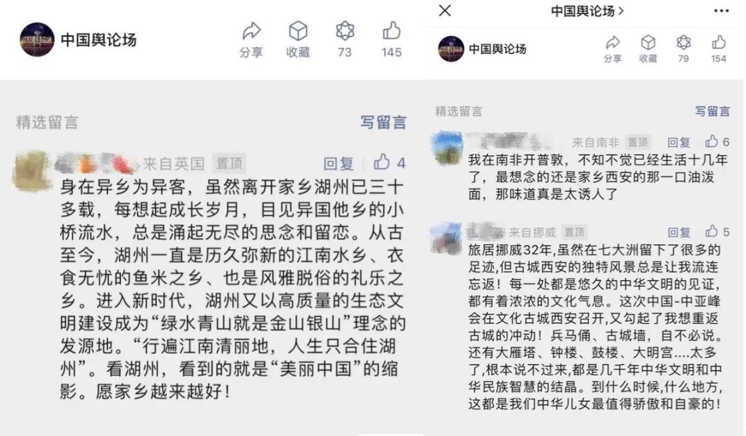 眾多網(wǎng)友紛紛留言表示,“華夏山河納祥福,人杰地靈展宏圖,千古傳!”“倍感溫暖親切”“引以為豪”“循夢而行,向陽而生”,滿屏正能量。而更多的留言是“歡迎來到中國黃梅戲之鄉(xiāng)安慶聽戲品茶”“大美鶴崗,生態(tài)優(yōu)良,這里是東方白鸛的故鄉(xiāng)。鶴崗人民歡迎全國各地的朋友來鶴崗打卡旅游”“土暖鍋、燕面揉揉、豬血燴豆腐、羊刀燉、攪團……慶陽好吃的風味美食太多啦”“湖水碧波蕩漾,候鳥如期而歸。早安中國!”等等,字里行間無不洋溢著對家鄉(xiāng)的自豪以及廣邀海內外朋友到此地一游的好客之情。