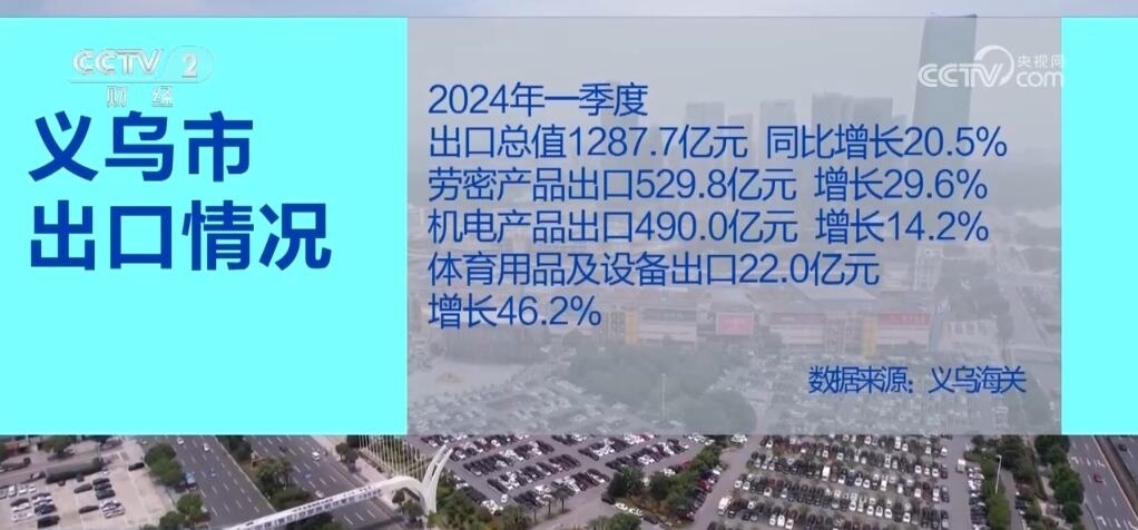數(shù)據(jù)顯示,2024年一季度,義烏市出口總值達1287.7億元,同比增長20.5%。其中,勞密產(chǎn)品出口529.8億元,增長29.6%;機電產(chǎn)品出口490.0億元,增長14.2%;而體育用品及設備出口達到22.0億元,增長46.2%。業(yè)內(nèi)人士表示,巴黎奧運會即將召開,以及外商圣誕采購季開始,歐美市場補庫存需求增加,使得相關產(chǎn)品出口占比顯著提升。