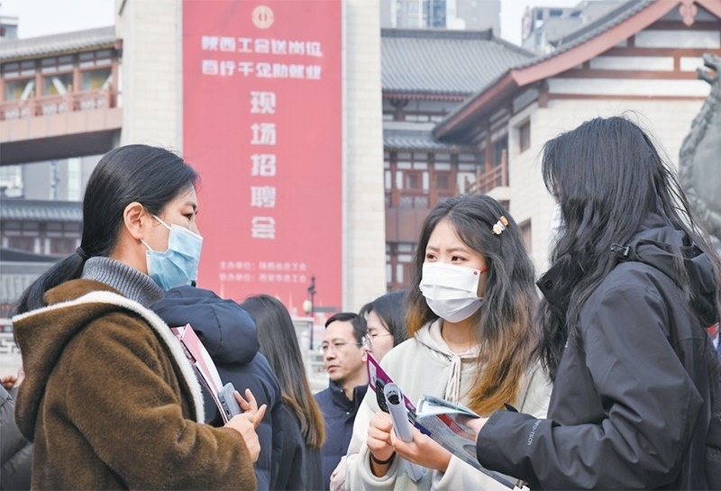 2024年3月6日,由陜西省總工會(huì)舉辦的2024年陜西工會(huì)“春送崗位”就業(yè)服務(wù)月啟動(dòng)儀式在西安舉行。與啟動(dòng)儀式同期舉辦的現(xiàn)場招聘會(huì)吸引約200家用人單位參加,提供崗位超過5000個(gè)。圖為當(dāng)日求職者在現(xiàn)場招聘會(huì)上與企業(yè)工作人員交流。 新華社記者 張博文/攝
