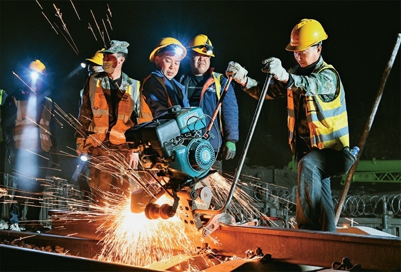 2024年4月10日,在內(nèi)蒙古包頭市,包銀高鐵引入包頭樞紐工程的關(guān)鍵控制性工程之一——包西上行線路撥接完成施工。此次施工完成,標(biāo)志著包銀高鐵引入包頭樞紐包頭站改造工程取得重大進(jìn)展,為包銀高鐵開通奠定堅(jiān)實(shí)基礎(chǔ)。圖為4月10日凌晨,工人在包西上行線路上作業(yè)。 新華社記者 劉磊/攝