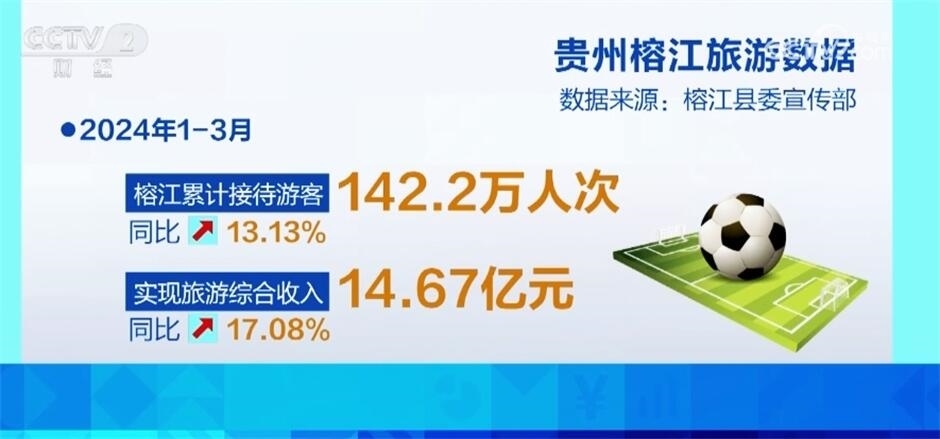 在“村超”流量的帶動(dòng)下,2024年1—3月榕江累計(jì)接待游客142.2萬人次,同比增長(zhǎng)13.13%,實(shí)現(xiàn)旅游綜合收入14.67億元,同比增長(zhǎng)17.08%。