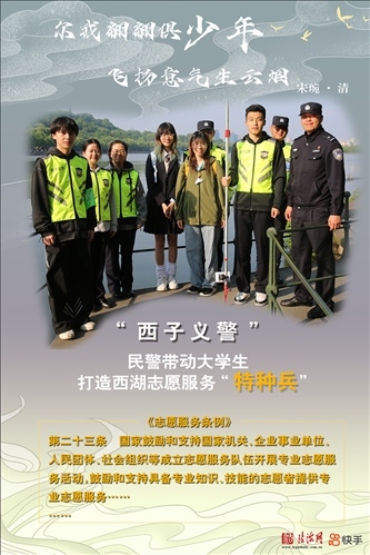 浙江省杭州市公安局西湖風景名勝區(qū)分局組織公安巡特警、消防、交警、行政執(zhí)法、平安志愿者等各方力量參與社會治理工作,逐漸壯大的“西子義警”隊伍已成為西湖邊守望平安的重要力量。近期,一群朝氣蓬勃的青年大學生加入“西子義警”隊伍,共同營造更加和諧的西湖景區(qū)平安環(huán)境。