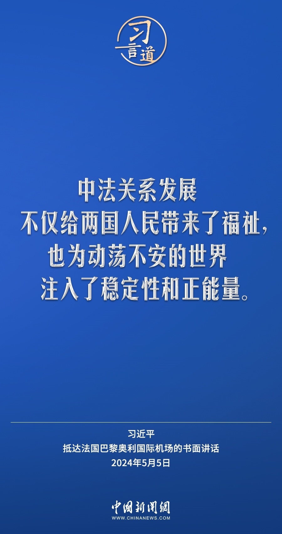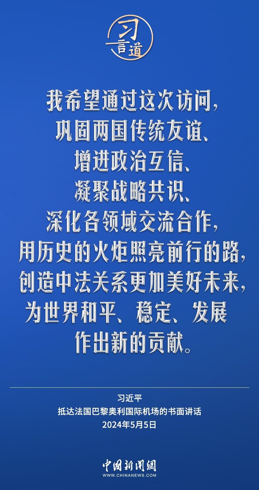 當(dāng)?shù)貢r(shí)間5月5日下午,國家主席習(xí)近平抵達(dá)巴黎,開始對法國進(jìn)行國事訪問。在抵達(dá)法國巴黎奧利國際機(jī)場的書面講話中,習(xí)近平指出——