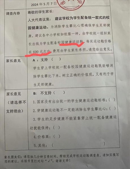 ·學(xué)校發(fā)調(diào)查表詢問(wèn)家長(zhǎng)“是否支持統(tǒng)一購(gòu)置約600元一雙的運(yùn)動(dòng)鞋”,淮北市教育局澄清:只是采集信息,沒(méi)其他意圖。