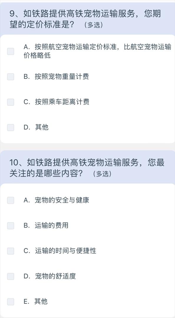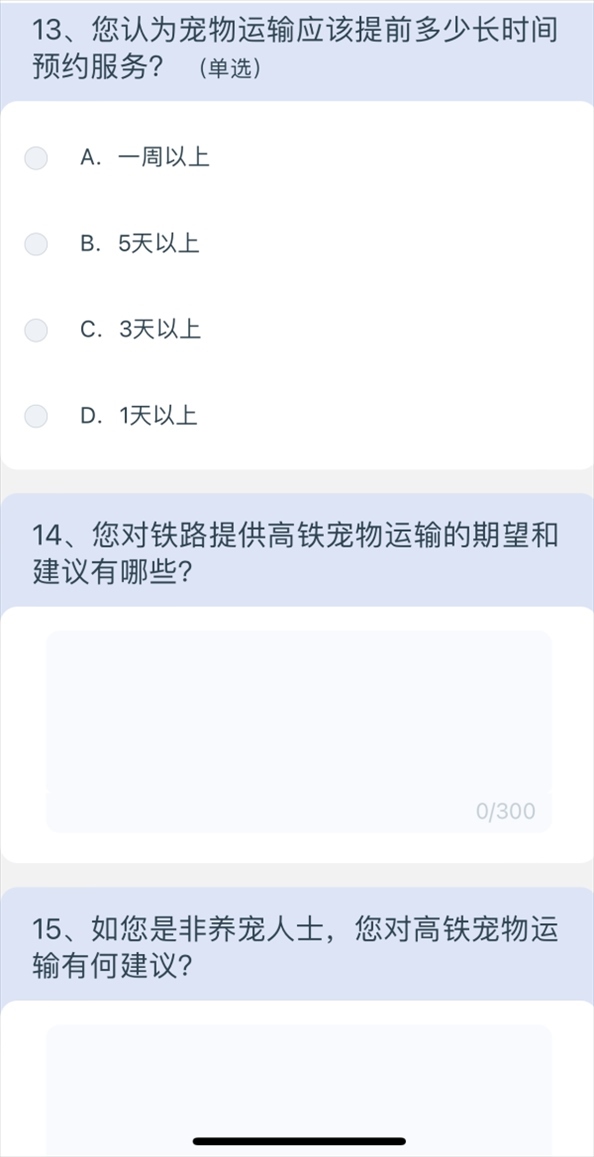 5月10日上午8點(diǎn)40分,澎湃新聞?dòng)浾咄ㄟ^(guò)掃描網(wǎng)友分享的列車(chē)上的二維碼,進(jìn)入12306系統(tǒng),選擇問(wèn)卷·建議,進(jìn)入“鐵路旅客高鐵寵物運(yùn)輸”調(diào)查,共15個(gè)問(wèn)題,涉及養(yǎng)寵類(lèi)型、是否有攜帶寵物出行的需求、如果鐵路提供寵物運(yùn)輸服務(wù)是否愿意嘗試等,以及為降低對(duì)其他旅客的影響,在高鐵寵物運(yùn)輸更關(guān)注哪方面的防護(hù);如鐵路提供高鐵寵物運(yùn)輸服務(wù),期望的定價(jià)標(biāo)準(zhǔn);如鐵路提供高鐵寵物運(yùn)輸服務(wù),最關(guān)注的內(nèi)容;如果是非養(yǎng)寵人士,對(duì)高鐵寵物運(yùn)輸有何建議等多方面問(wèn)題。