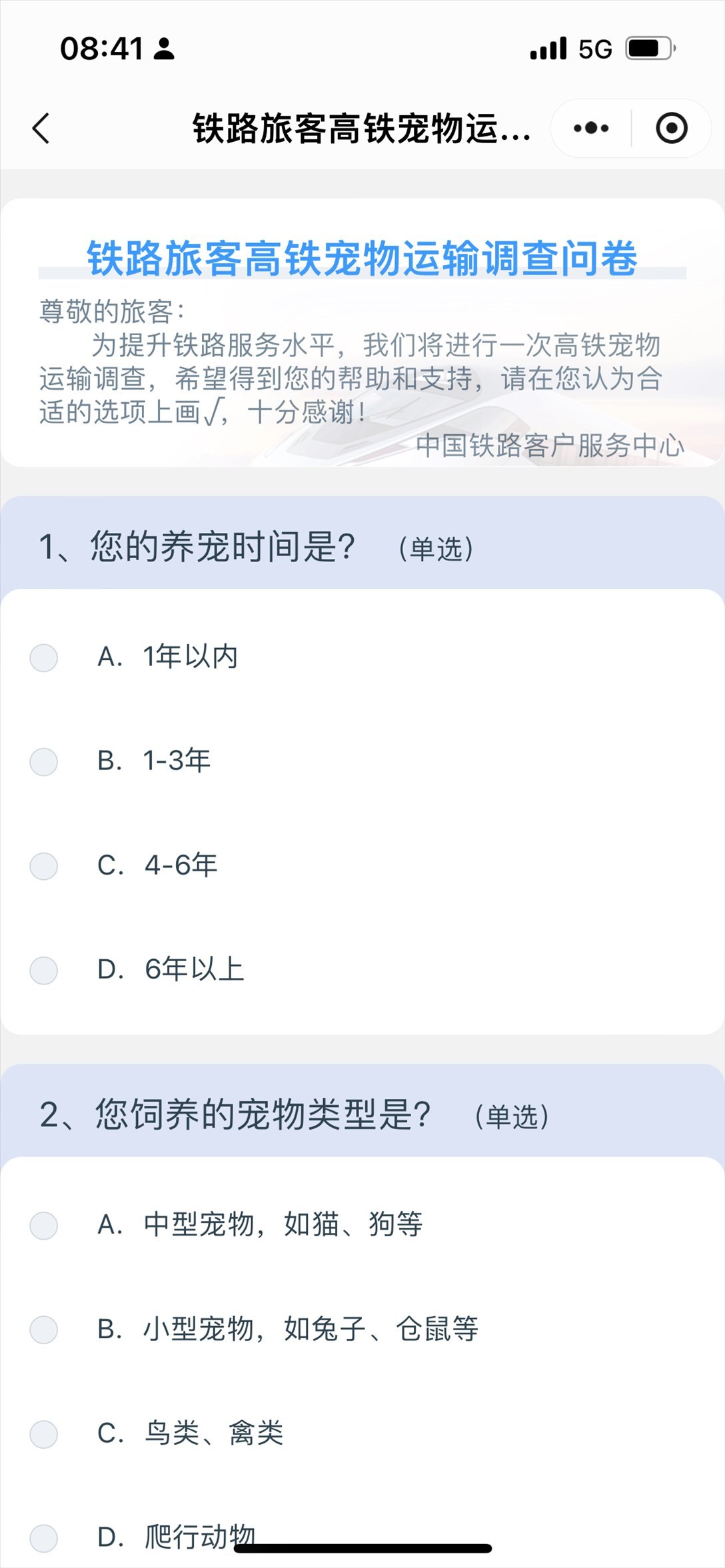 中國(guó)鐵路客戶(hù)服務(wù)中心推出高鐵寵物運(yùn)輸調(diào)查問(wèn)卷。 截屏圖
