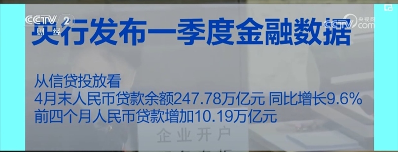 從信貸投放看,4月末,人民幣貸款余額247.78萬(wàn)億元,同比增長(zhǎng)9.6%。前4個(gè)月,人民幣貸款增加10.19萬(wàn)億元。