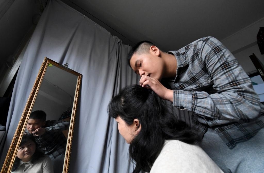 ?↑在位于廣西南寧市北湖北路的出租房里,陽(yáng)陽(yáng)幫媽媽何冬艷拔白頭發(fā)(2023年3月31日攝)。