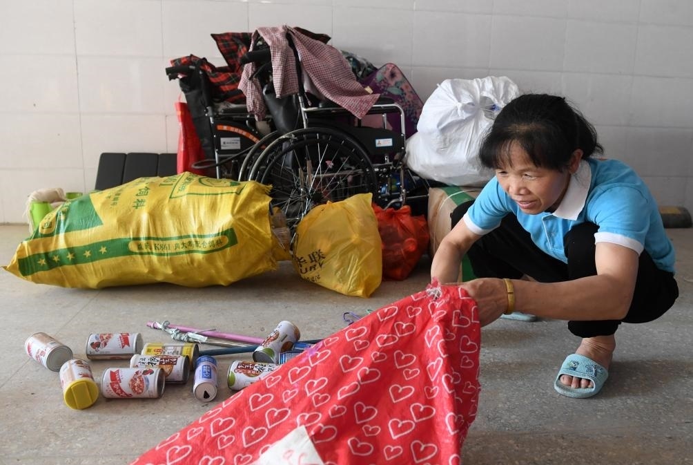 ?↑在廣西東蘭縣高級(jí)中學(xué),黃乜鮮在收拾撿回來(lái)的廢舊物品(2020年5月9日攝)。