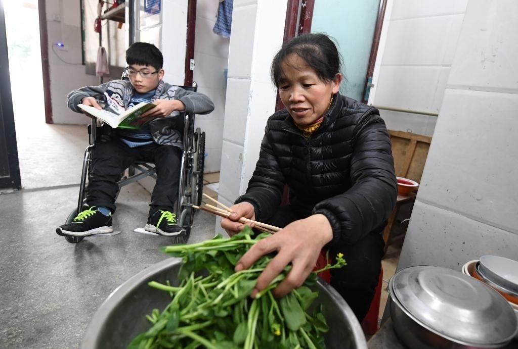黃必華到縣城上高中后,黃乜鮮住到學(xué)校給他們母子倆免費(fèi)提供的宿舍里,每天背兒子到教室上課,照顧兒子的生活,空閑時(shí)在學(xué)校小賣部打零工賺點(diǎn)生活費(fèi)。