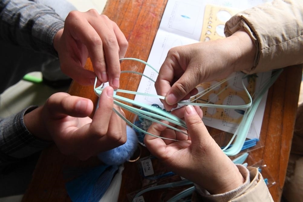 ?↑在位于廣西南寧市北湖北路的出租房里,何冬艷和兒子陽(yáng)陽(yáng)在做手工(2023年3月31日攝)。
