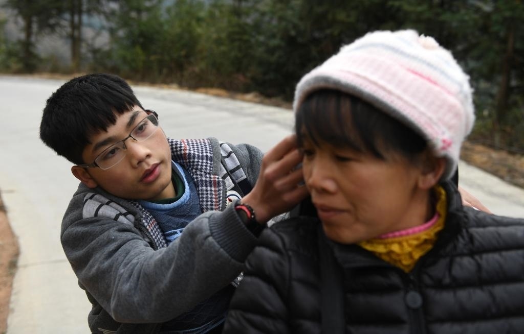 ↑黃必華在上學(xué)路上為媽媽黃乜鮮整理帽子擋風(fēng)(2018年2月26日攝)。