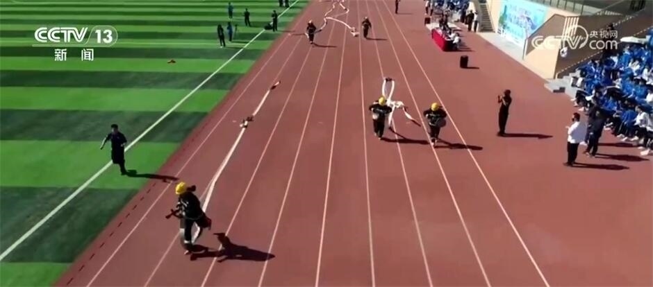 發(fā)令員一聲哨響,幾名消防員手持水槍水帶,飛快向前沖出。這是在山東濟(jì)寧某中學(xué)舉行的首屆“消防安全運(yùn)動會”上,消防員模擬救援現(xiàn)場進(jìn)行的四百米五帶三槍操法展示。