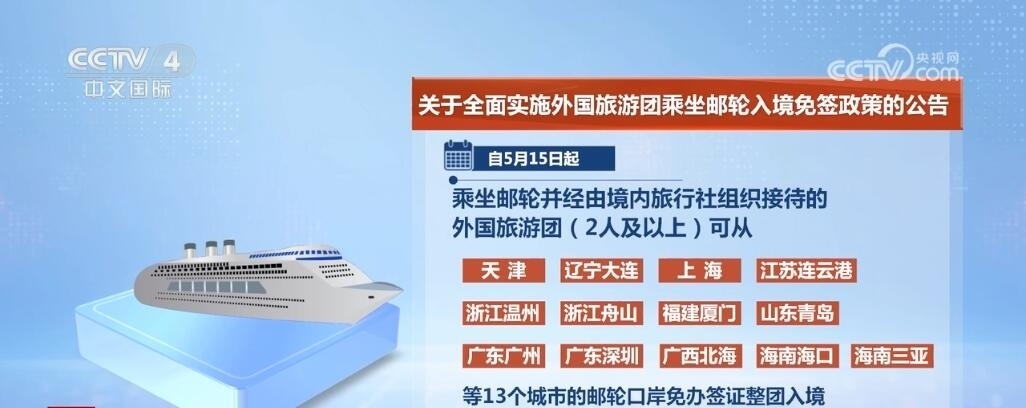 央視網(wǎng)消息:中國(guó)國(guó)家移民管理局發(fā)布公告,為進(jìn)一步促進(jìn)便利外籍人員來華旅游,自5月15日起,在中國(guó)沿海省份全面實(shí)施外國(guó)旅游團(tuán)乘坐郵輪入境免簽政策,乘坐郵輪來華并經(jīng)由境內(nèi)旅行社組織接待的外國(guó)旅游團(tuán)可從中國(guó)沿海所有郵輪口岸免辦簽證入境停留15天。