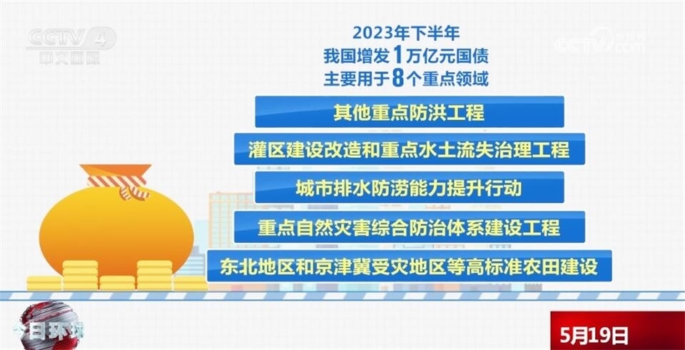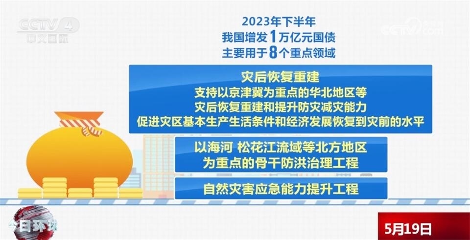 去年下半年,我國增發(fā)了1萬億元國債,主要用于8個重點領域,包括災后恢復重建,支持以京津冀為重點的華北地區(qū)等災后恢復重建和提升防災減災能力,促進災區(qū)基本生產生活條件和經濟發(fā)展恢復到災前的水平,以海河、松花江流域等北方地區(qū)為重點的骨干防洪治理工程,自然災害應急能力提升工程,其他重點防洪工程,灌區(qū)建設改造和重點水土流失治理工程,城市排水防澇能力提升行動,重點自然災害綜合防治體系建設工程,東北地區(qū)和京津冀受災地區(qū)等高標準農田建設。