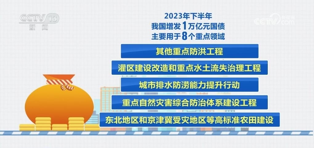 去年下半年,我國(guó)增發(fā)了1萬(wàn)億元國(guó)債,主要用于8個(gè)重點(diǎn)領(lǐng)域,包括:災(zāi)后恢復(fù)重建,支持以京津冀為重點(diǎn)的華北地區(qū)等災(zāi)后恢復(fù)重建和提升防災(zāi)減災(zāi)能力,促進(jìn)災(zāi)區(qū)基本生產(chǎn)生活條件和經(jīng)濟(jì)發(fā)展恢復(fù)到災(zāi)前的水平;以海河、松花江流域等北方地區(qū)為重點(diǎn)的骨干防洪治理工程;自然災(zāi)害應(yīng)急能力提升工程;其他重點(diǎn)防洪工程;灌區(qū)建設(shè)改造和重點(diǎn)水土流失治理工程;城市排水防澇能力提升行動(dòng);重點(diǎn)自然災(zāi)害綜合防治體系建設(shè)工程;東北地區(qū)和京津冀受災(zāi)地區(qū)等高標(biāo)準(zhǔn)農(nóng)田建設(shè)。