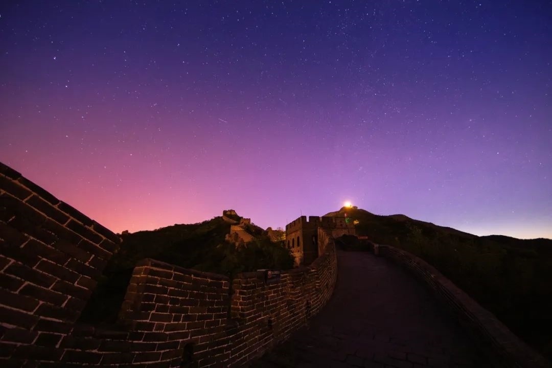 這條巨龍就是北京八達(dá)嶺長(zhǎng)城。夜色下的八達(dá)嶺長(zhǎng)城有著和白天不一樣的美,她更深邃、更安靜,仿佛無(wú)聲講述著千百年來(lái)的歷史賡續(xù)。