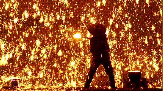 夜幕中,八達(dá)嶺長(zhǎng)城流光溢彩。舉目望去,流火似金,濺星如電。但見(jiàn)匠夫一揮臂,沖天鐵花飛寰宇。千萬(wàn)點(diǎn),夜放花千樹(shù),天地間。