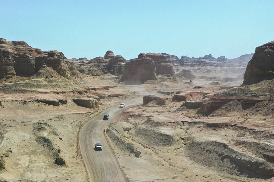 在新疆克拉瑪依市烏爾禾區(qū)世界魔鬼城景區(qū),車友在自駕線路上疾馳(5月1日攝,無人機(jī)照片)。新華社記者 丁磊 攝