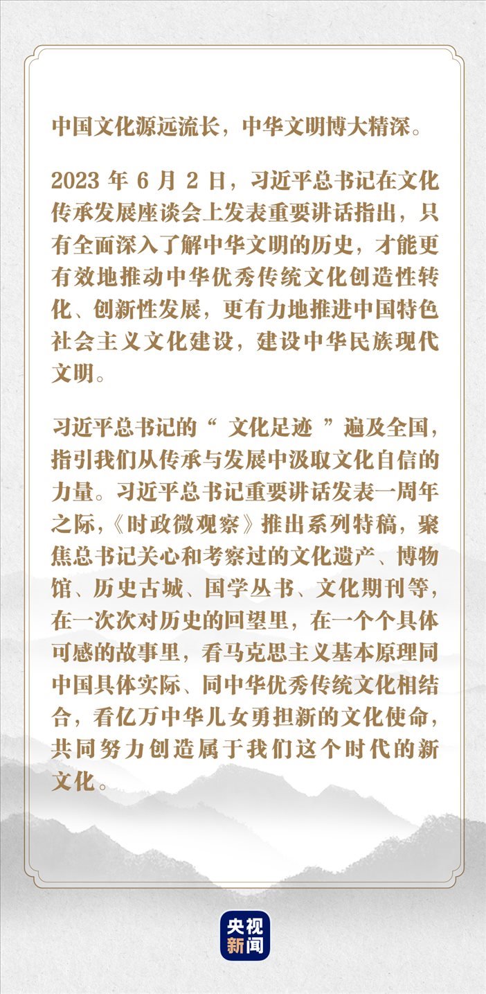 “這段時間,我一直在思考推進(jìn)中國特色社會主義文化建設(shè)、建設(shè)中華民族現(xiàn)代文明這個重大問題?!?023年6月2日,在文化傳承發(fā)展座談會上,習(xí)近平總書記指出,“只有全面深入了解中華文明的歷史,才能更有效地推動中華優(yōu)秀傳統(tǒng)文化創(chuàng)造性轉(zhuǎn)化、創(chuàng)新性發(fā)展,更有力地推進(jìn)中國特色社會主義文化建設(shè),建設(shè)中華民族現(xiàn)代文明?!?/p>